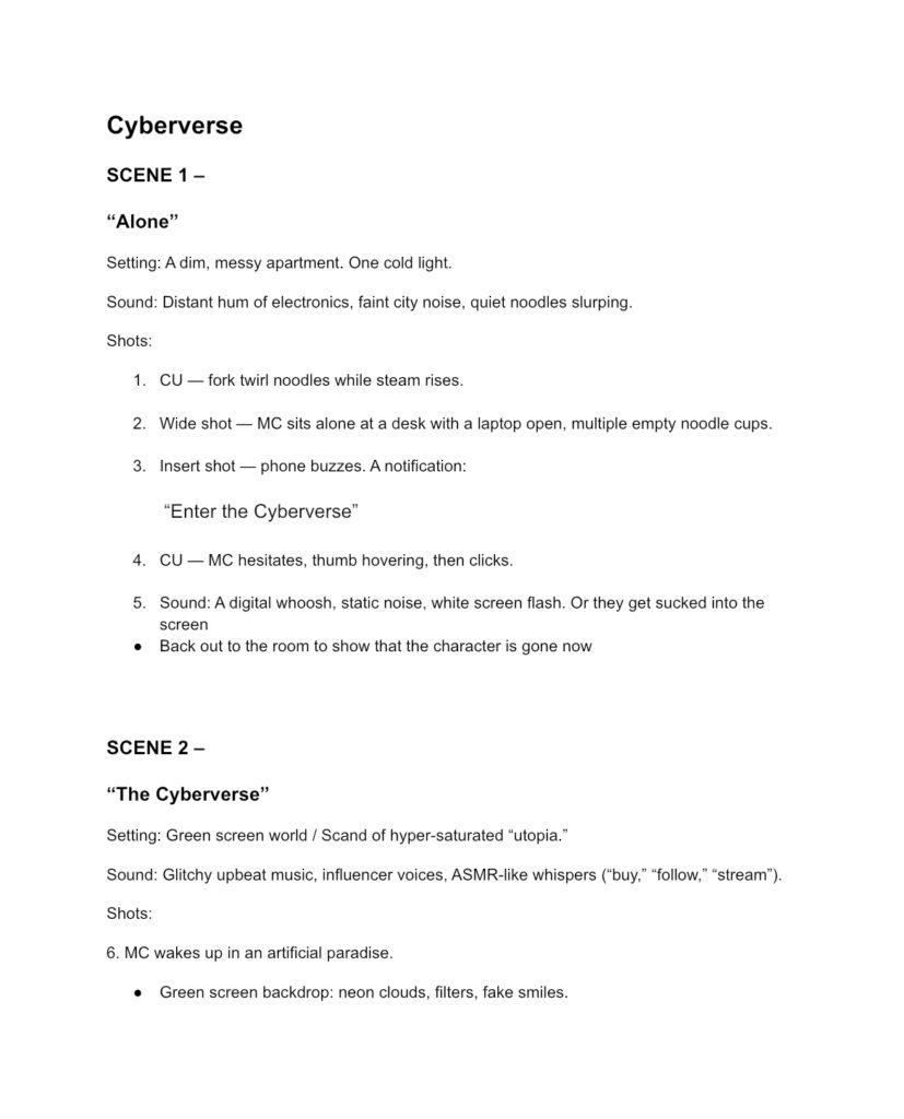 Before the main character gets pulled into the metaverse, the video opens with private, lonely moments like walking to the convenience store and eating noodles by themselves. To illustrate the character’s loneliness, it opens with silence and coldness. They display their melancholy and frantic search for happiness by donning a shirt that reads, “I heart Tequila.” Everything seems flawless in this digital world: flawless avatars with beautiful bodies, a never-ending supply of selfies and ads, and an economy based on engagement metrics, product promotion, and selfies. I tried to give a clue that this world is not as amazing as everyone believes by removing the eyes of the characters to convey a soullessness. I was motivated to study speculative design and fiction by the ways in which artists such as Ian Cheng, Hito Steyerl, and Wangechi Mutu employ world-building to reveal modern power structures. In my work, the metaverse functions as a mirror and a fantasy, showing how loneliness, poverty, and the need for approval influence our online activity.