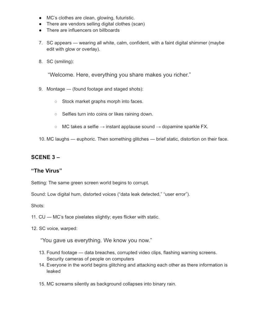 Characters start to malfunction and become unstable as the digital world descends into an apocalyptic state due to a “data virus.” The protagonist’s discovery that they utilized the internet for greed, comfort, escape, and ultimately to fill a gap that technology cannot fill is analogous to this collapse. I was able to magnify these dynamics while staying rooted in the emotional reality of our contemporary interaction with digital life through the use of speculative imagining.