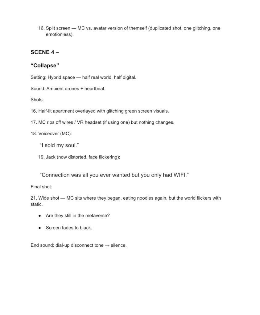In our video, Jacks and I investigate a hypothetical future in which personal connection is replaced by digital connection and our identities are solely maintained through online contributions. I started with a straightforward query: What if WiFi was the only remaining true link in the world? From that “what if,” I created a metaverse that promises nirvana but is more like a dopamine minefield, where survival depends on visibility, cooperation, and constant engagement.