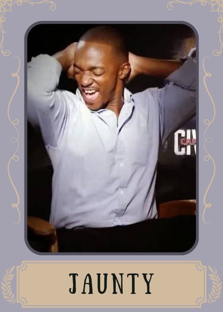 - Jaunty – be carefree dance when you feel like for you never know when your last chance to bust a move could be.